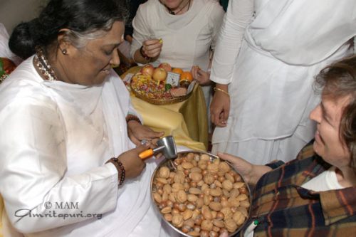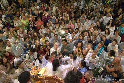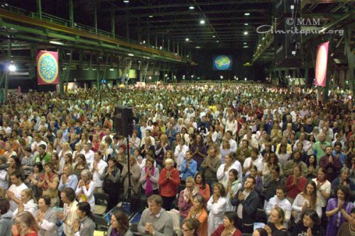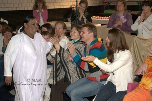 Za nami je že drugo letošnje srečanje z Ammo, tokrat v Münchnu, ki je bil tudi glavni program za obiskovalce iz Slovenije. Prvi dan sem se sam z osebno izkušnjo seznanil z delovanjem vrste za vprašanja, kjer lahko Ammo vprašaš karkoli, kar te teži in če Amma vidi, da potrebuješ odgovor v fizični obliki, ti bo preko prevajalca tako tudi odgovorila. V Münchnu ali pri nas lahko dobite na vpogled navodila v slovenščini, kako lahko pridete do Amminega odgovora. Tako sedaj lahko vsaj na nemških programih najpomembnejša tiskana navodila zahtevate tudi v slovenščini.