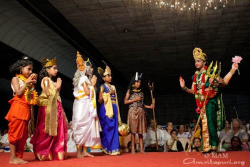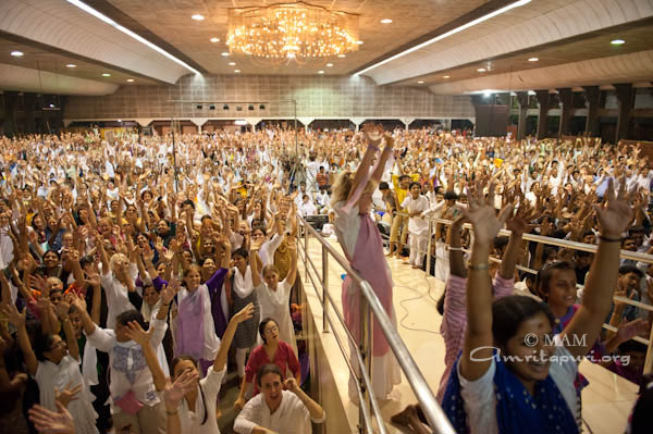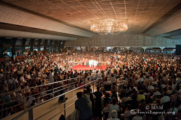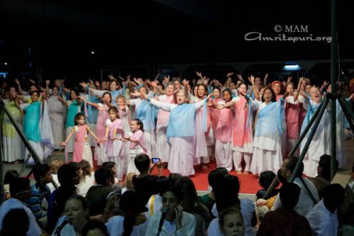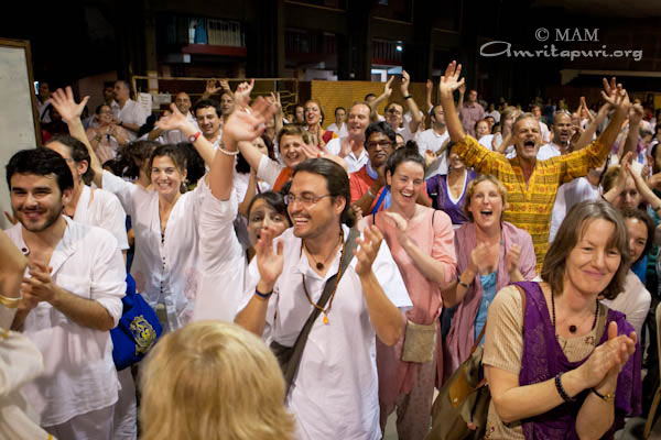 Po govoru je Amma vse povabila, da 18-krat recitirajo Lokah Samastah Sukinau Bhavantu. Nato je Amma blagoslovila polne sklede Heršejevih poljubčkov in vsakomur naročila, da naj vzame le enega. Ko je bilo videti, da se Daršan bliža h koncu, so glasbeniki, ki so pred tem igrali v predstavah, pričeli igrati Bara Gopala Bala. Amma je vzela mikrofon in zapela. V nekaj trenutkih so se pred odrom izoblikovali majhni krogi plesalcev: fantje na levi in dekleta na desni strani. Poskakovali so gor in dol, z rokami valovili po zraku, prevzela jih je ekstatična radost. Navdihnjeni od Amminega glasu in vse hitrejšega ritma je po vsej dvorani pričelo plesati še več ljudi. To se je nadaljevalo, dokler ni glasba sčasoma ponehala. Potem je na veliko veselje vseh Amma pričela peti Mata Rani. V trenutku so se tudi tisti, ki so še vedno sedeli na svojih sedežih, dvignili na noge in se pridružili plesu. To je trajalo in trajalo in medtem je cela dvorana znova in znova vzklikala: »Ki Jai!«,da je skoraj odpihnilo streho z dvorane. Toliko veselja je bilo!