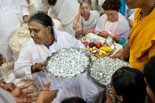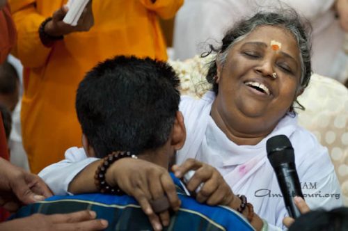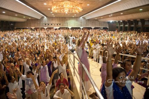 Ko se je vzklikanje »Ki Jai!« poleglo, je Amma vse povabila k molitvi za mir in srečo v svetu. Amma je pričela peti Kushiyom Ki Bahar – na velikih zaslonih v dvorani pa jo je spremljal angleški prevod besedila. Ko so na koncu vsi ponavljali: “Lokah Samastah Sukhino Bhavantu”, sta se radost in vznesenost preobrnili v svečanost. Nad množico se je spustila tišina. Ko so odhajali, so vsi premišljevali o Amminem novoletnem sporočilu, čutili sladek okus čokolade, in željo, da bi bila vsa bitja v vseh svetovih srečna.