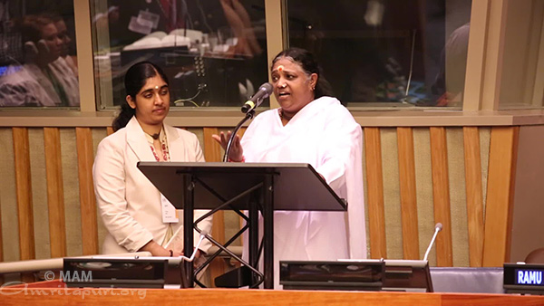Nekateri od vas se morda sprašujete: “Ali je duhovni osebi, kot je Amma, sploh mesto tukaj?” Tisto, kar me je danes pripeljalo sem, je moja vera v nespornost duhovnega znanja. Pogosto globoko premišljujem o prihodnosti Zemlje, o ohranjanju narave in izginjanju harmonije med človeštvom in naravo. Ta kontemplacija me je privedla do prepričanja, da se morajo znanost, tehnologija in duhovnost združiti, da bi zagotovili trajnosten in uravnotežen obstoj našega sveta. Današnja doba in svet okrog nas zahtevata to preobrazbo.