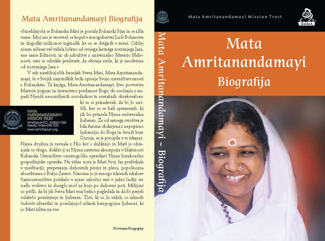3. “Mata Amritanandamayi Biografija”: knjiga opisuje težko Ammino življenje od njenega rojstva vse do takrat, ko so se okrog nje začeli zbirati učenci z vsega sveta in je nastal ašram. Deklica, ki ni imela ničesar, niti pedi svoje zemlje in si je sama šivala oblačila iz starih ponošenih oblek svojih sester in katero so starši zanemarjali ter zlorabljali in jo imeli za služkinjo, je postala svetovno znana humanitarna in duhovna voditeljica, ki danes vodi številne bolnišnice, sirotišnice, šole, univerze, domove za ostarele ter zbira sredstva (štipendije in pokojnine) za revne, vdove, onemogle, prizadete zaradi naravnih nesreč, ne le v Indiji, temveč za vse na svetu, ki potrebujejo pomoč. Knjiga je izredno navdihujoča in Ammino življenje nam je lahko vzgled, kako lahko tudi najbolj revni živijo srečno in duhovno življenje ter pomagajo drugim.