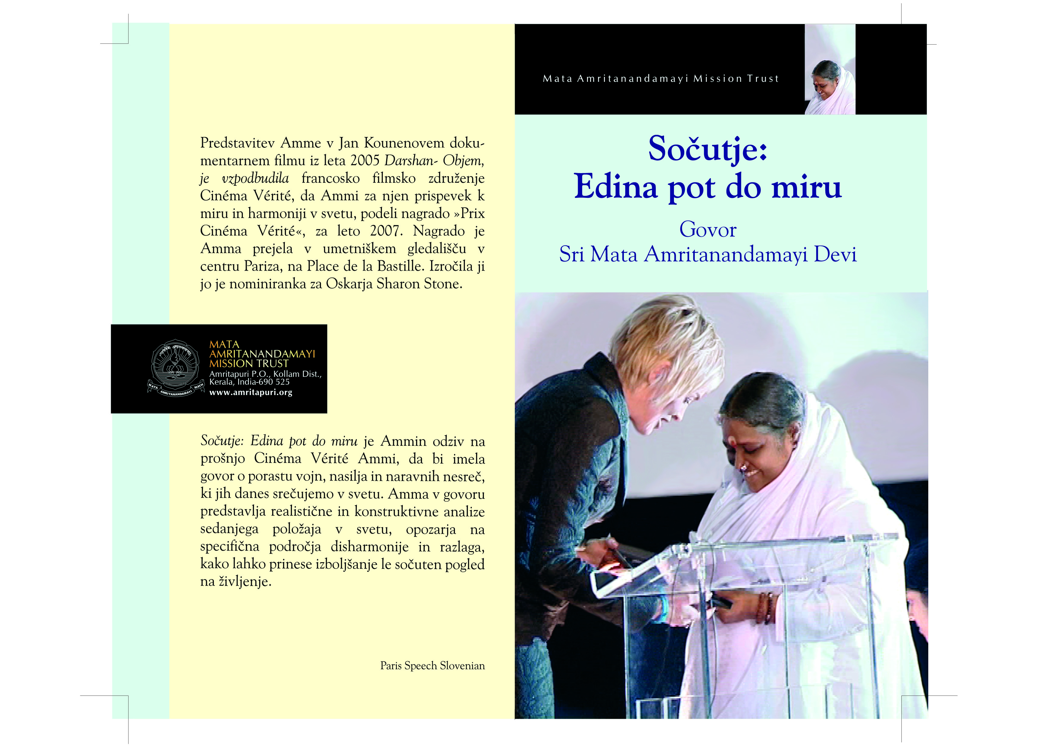 2. “Sočutje – Edina pot do miru”: to je govor o vse večjih katastrofah in naravnih nesrečah, ki ga je imela Amma leta 2007 v Parizu, ko je prejela nagrado Cinema Verite za svoje izjemno delo na področju vzpostavljanja svetovnega miru in harmonije. Knjižica je zelo poučna in navdihujoča ter polna globokih življenjskih zgodbic.
